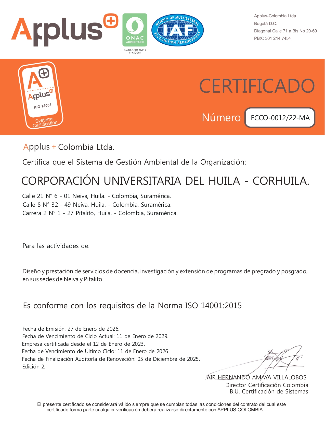 La Corporación Universitaria del Huila – CORHUILA, ha unificado su Sistema de Gestión de la Calidad NTC ISO9001:2015 (con el cual garantiza un alto nivel de servicio y la satisfacción de sus partes interesadas), su Sistema de Gestión de la Seguridad y Salud en el Trabajo NTC ISO 45001:2018 (por medio del cual identifica, evalúa y controla los riesgos que puedan afectar a sus colaboradores) y su Sistema de Gestión Ambiental NTC ISO 14001:2015 (con el cual ha desarrollado procesos y prácticas que reducen el impacto ambiental producto de sus actividades), conformando así un Sistema Integrado de Gestión – SIG que promueve y facilita la mejora continua institucional en articulación con su Propósito Superior y Esencia Institucional.