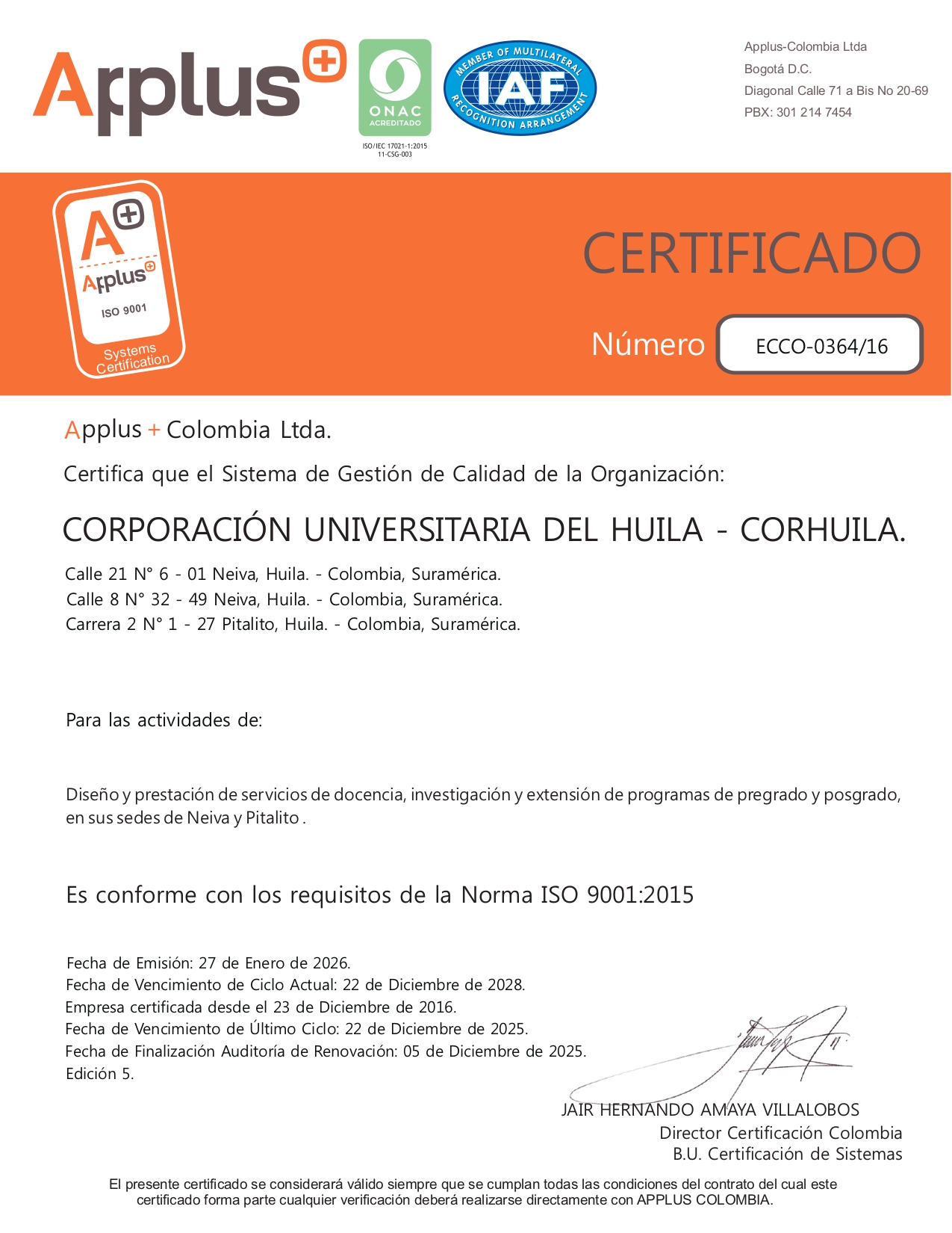 La Corporación Universitaria del Huila – CORHUILA, con su Sistema de Gestión de la Calidad (SGC) garantiza que sus servicios cumplan con los máximos estándares de calidad, pues este ayuda a coordinar y dirigir las actividades a partir de la planeación, control y vigilancia de aquellos elementos que de alguna manera afectan o influyen en la satisfacción del cliente y en el logro de los resultados deseados por la institución.
