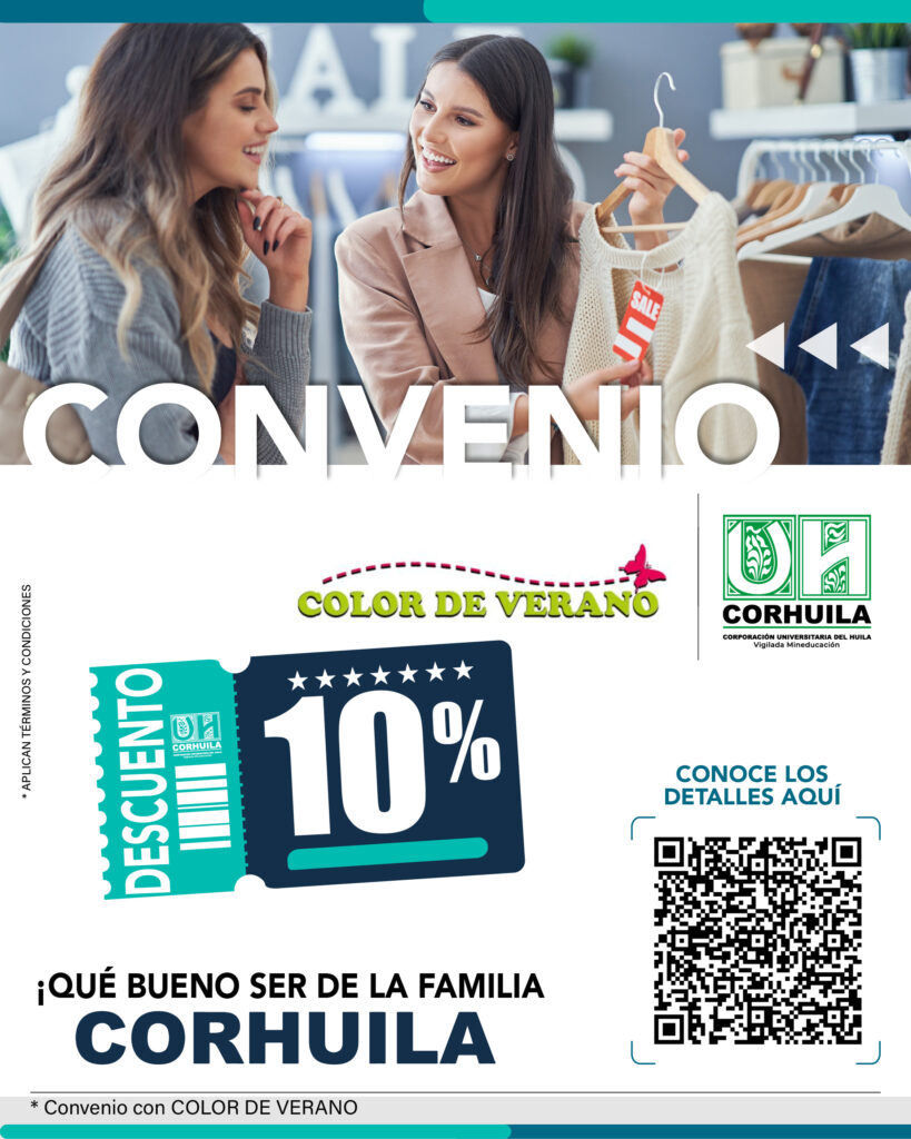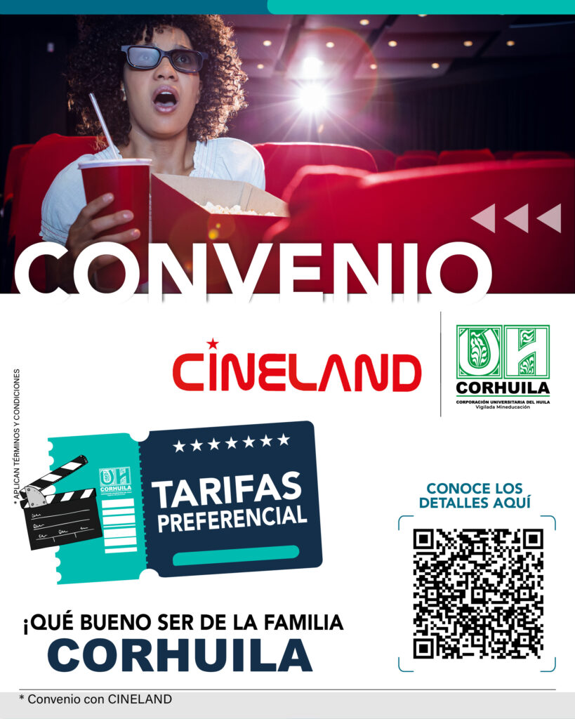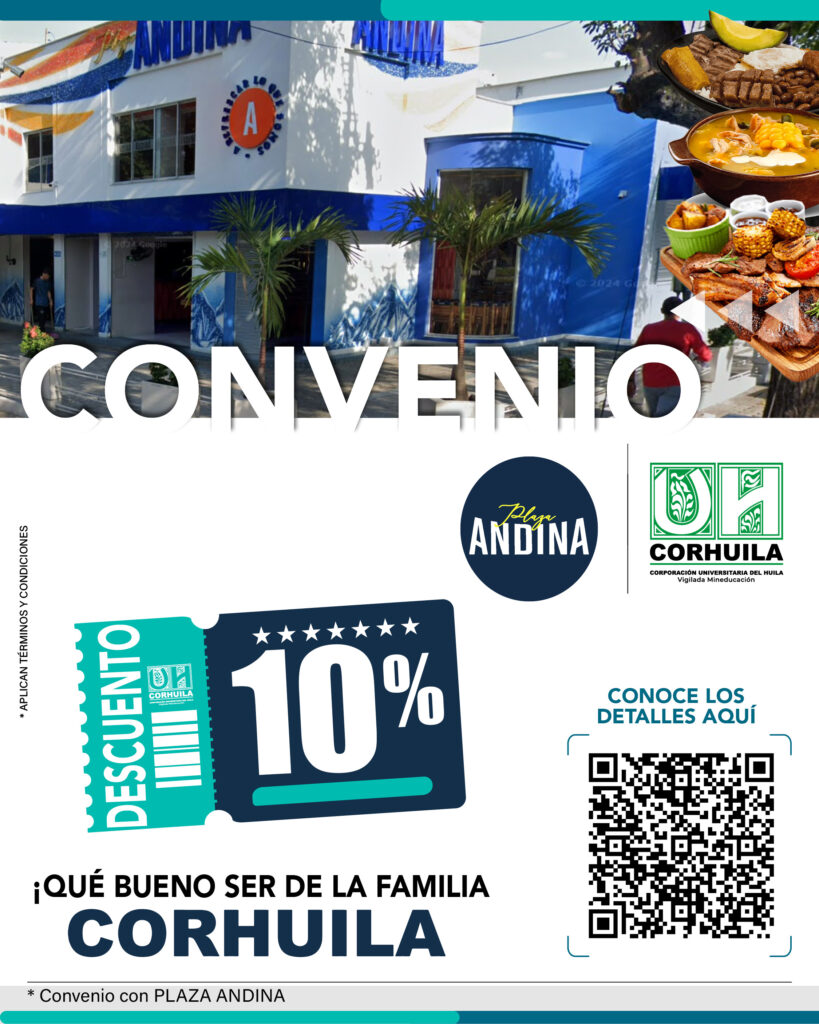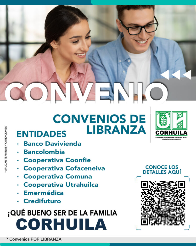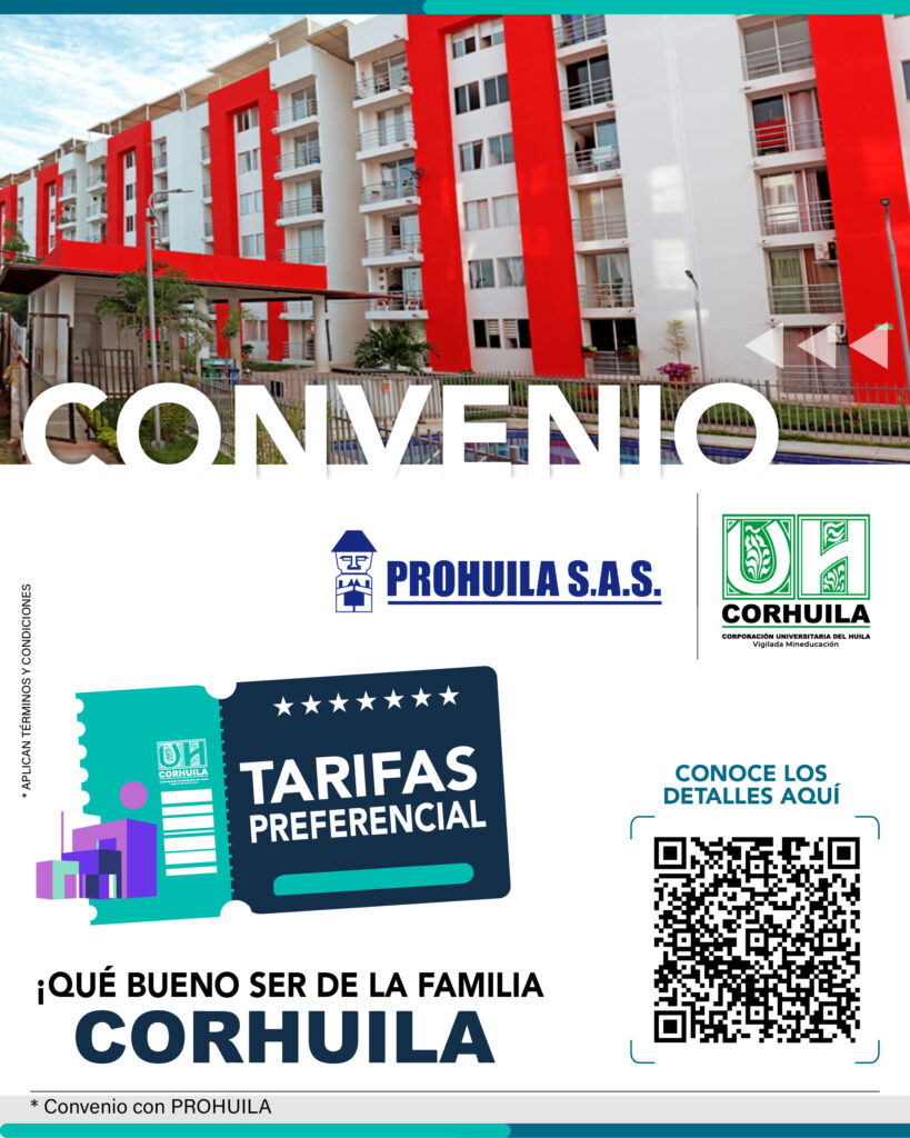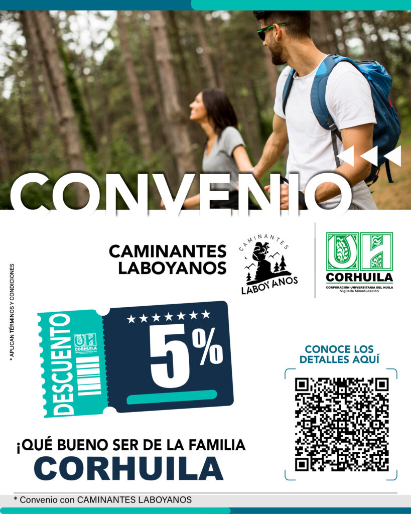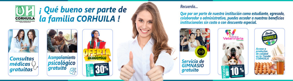 La Corporación Universitaria del Huila – CORHUILA es consciente de la importancia de garantizar espacios de bienestar para toda su comunidad, por eso, además de brindar espacios internos, cuenta con diferentes convenios con entidades y empresas externas que permiten a administrativos, colaboradores, estudiantes, docentes y egresados disfrutar de beneficios para ellos y sus familias.