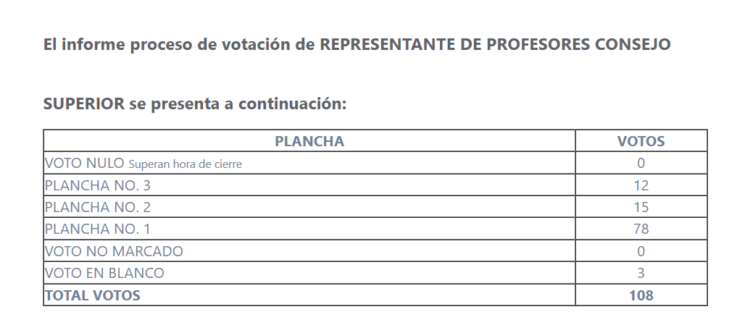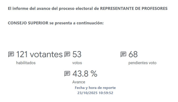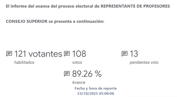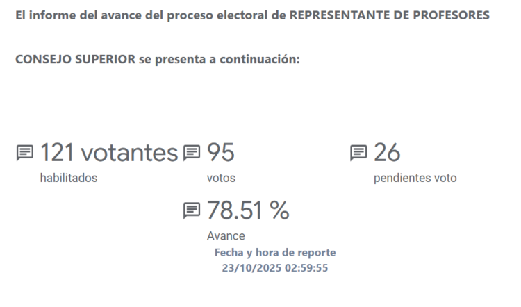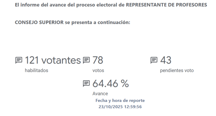De conformidad con el literal e) del artículo 6 del Acuerdo 829 de 2024, se informa a través de un reporte general cada dos (2) horas, el número de votantes a la comunidad académica por los medios institucionales.